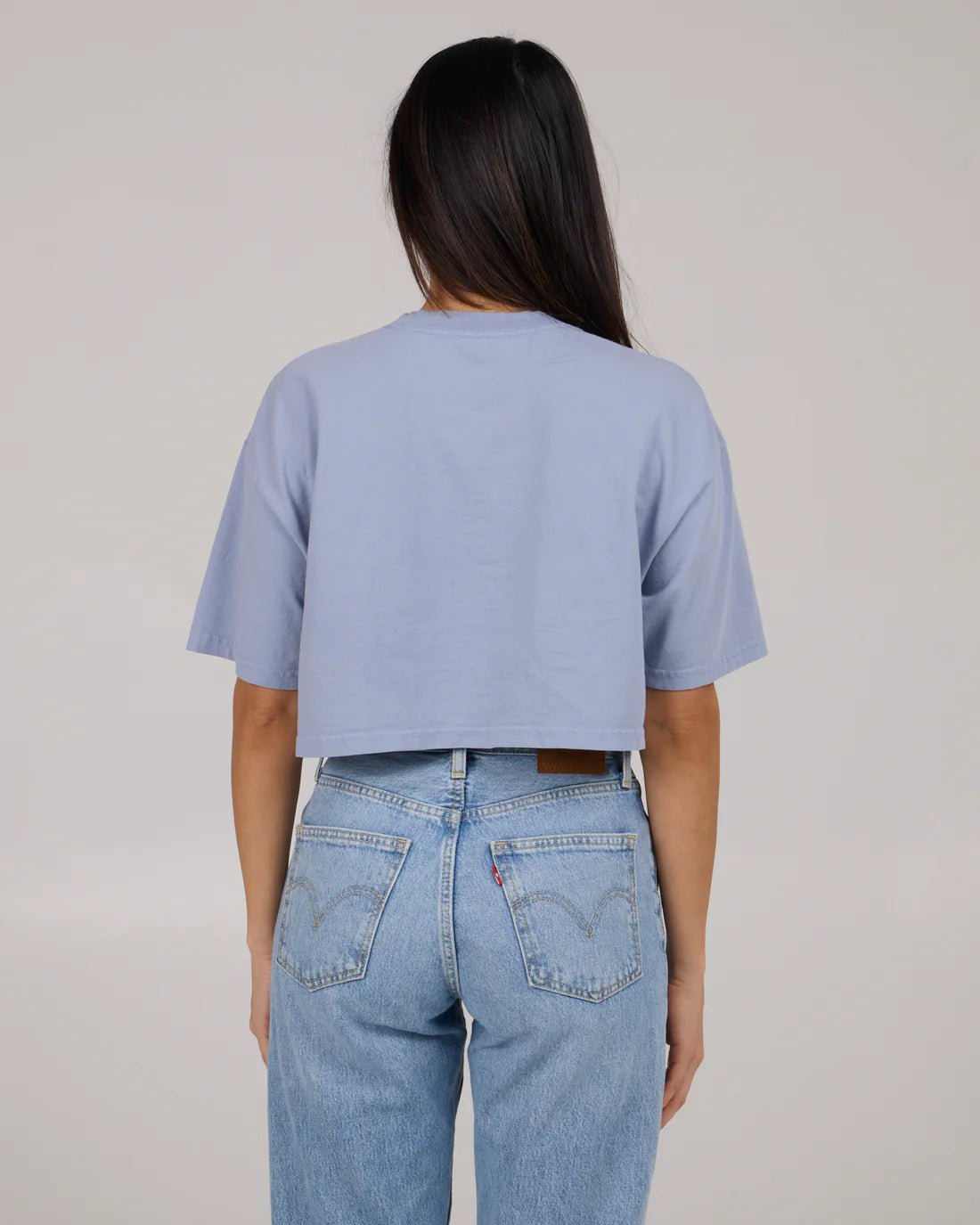 Introducing the Salty Crew Women's Buoy Tee in Violet Blue. Made of 100% cotton jersey, this oversize cropped tee features a convenient chest pocket with a unique screen print design. Stay stylish and comfortable all day long.