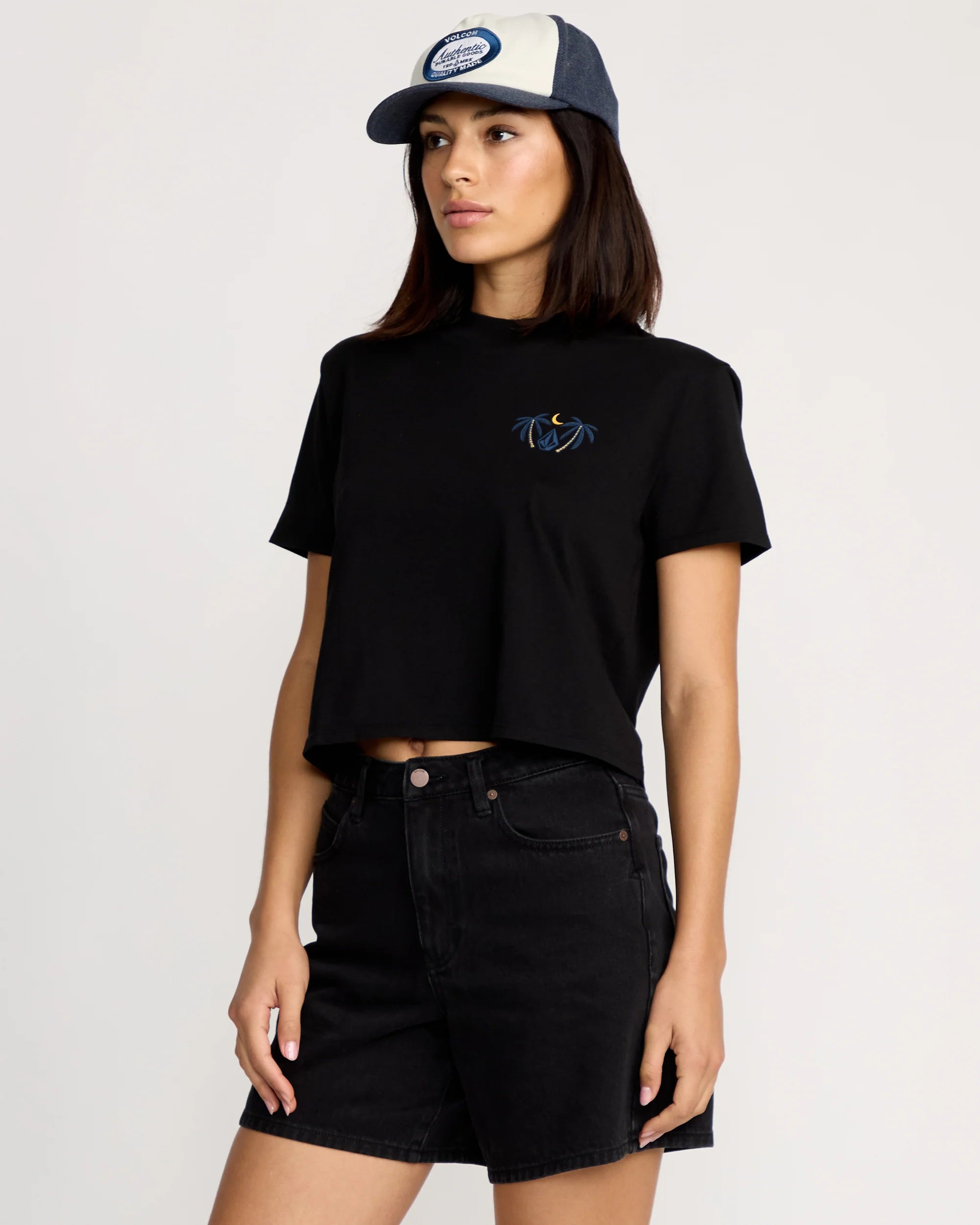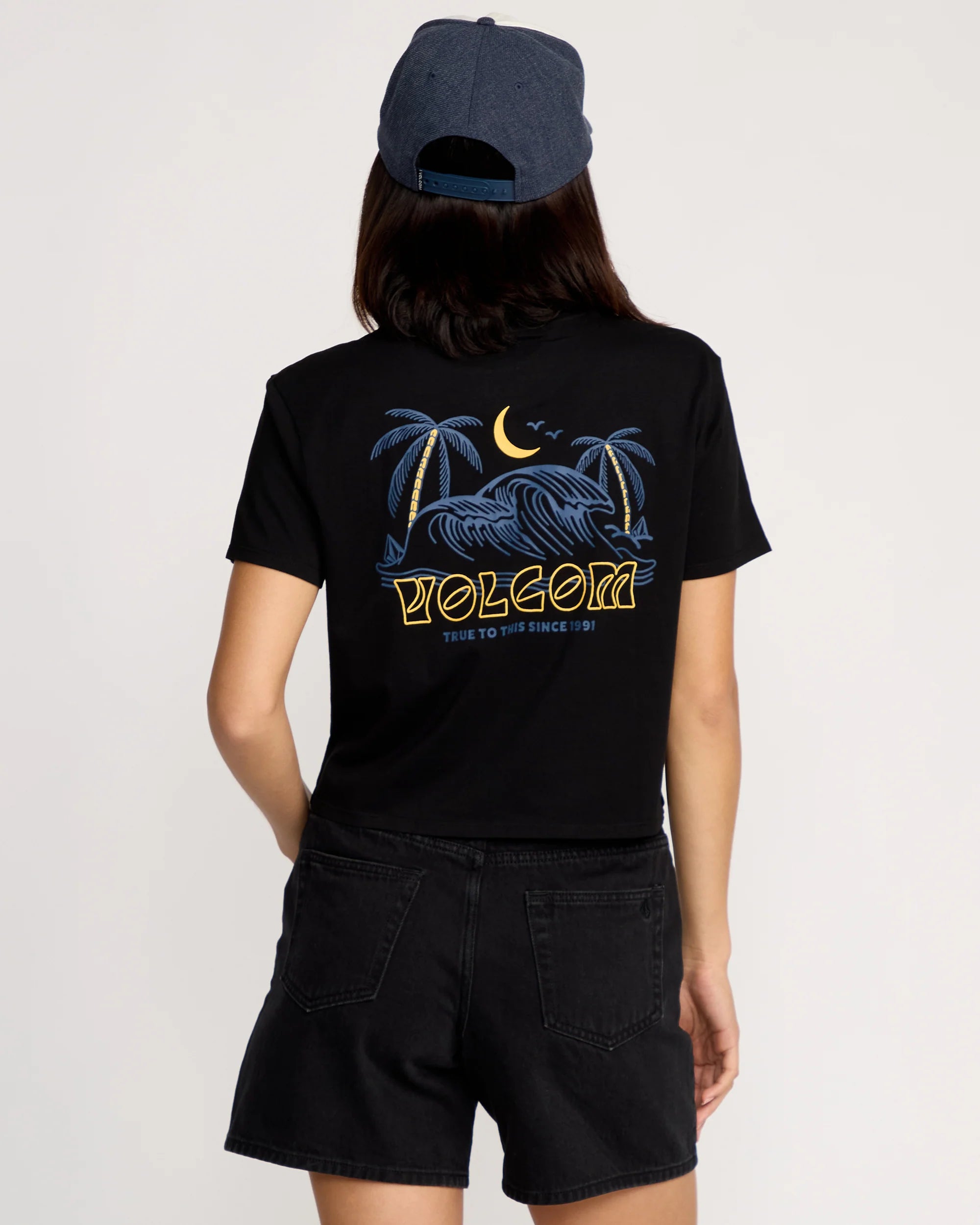 The Volcom Women's "Dial" Cropped Tee in black combines effortless style with comfort. Made from 100% organic cotton jersey (160 GSM), it feels soft and breathable for all-day wear. Its cropped cut adds a trendy edge, perfect for pairing with high-waisted jeans or skirts. This tee is a versatile staple that keeps your look fresh and relaxed with sustainable, natural fibers.