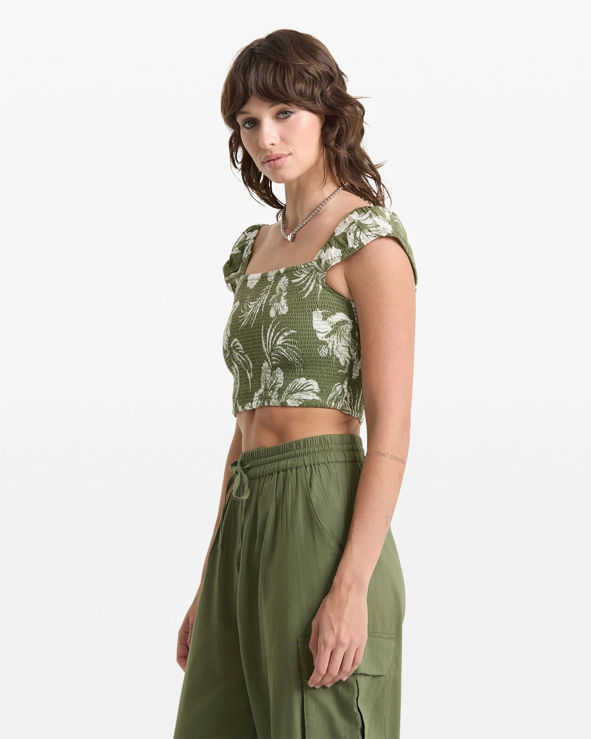 Forget room service—Vroom Service delivers style on demand. This allover-printed smocked crop top features a clean straight neckline and versatile elasticated cap sleeves that slip on or off the shoulder. The cropped 17-inch silhouette pairs perfectly with high-waisted bottoms, while the soft, flowy viscose fabric in Moss Stone keeps you comfortable all day. Finished with a subtle metal plate detail at the back for an understated edge.
